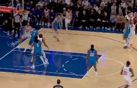 虎扑03月05日讯 NBA常规赛,尼克斯主场迎战雷霆的比赛正在进行中。比赛的第三节,布伦森强投三分颠...